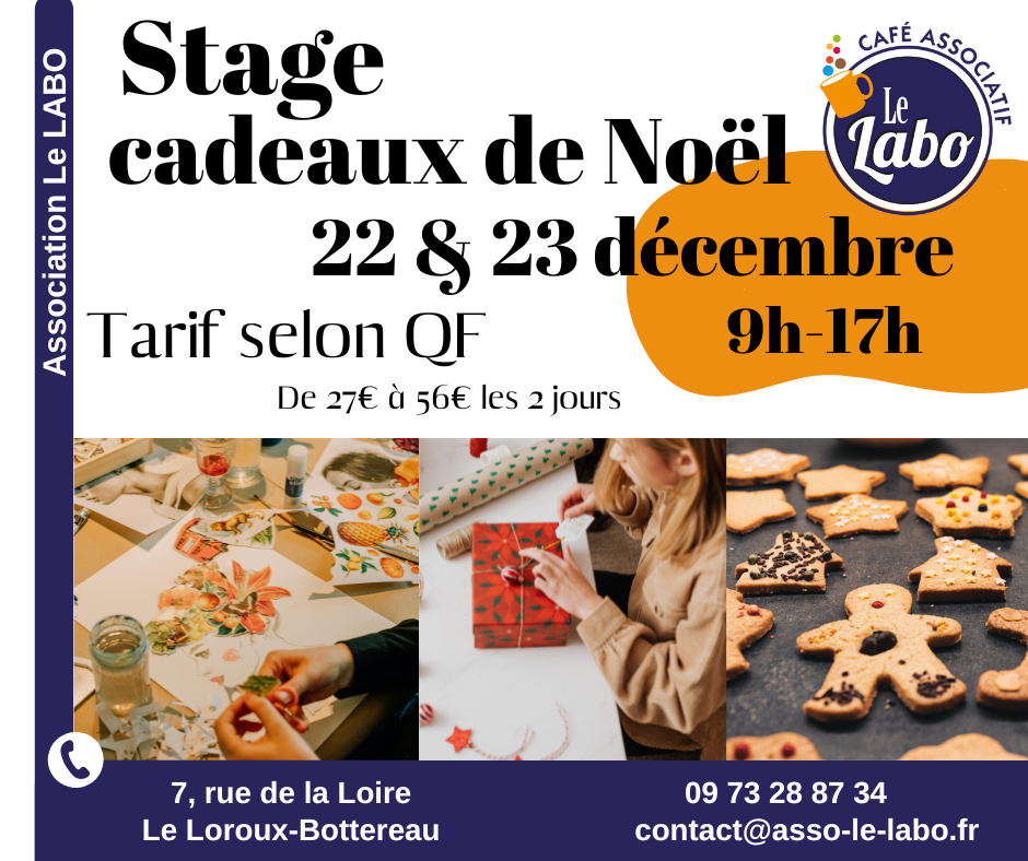 Les stages 2 jours : Les enfants sont accueillis au Labo de 9h à 17h par Sabine. Tout le matériel est fourni. Vous prévoyez le repas du midi (frigo, micro-onde et vaisselle sur place), nous nous chargeons des goûters (faits maison). Stage 2 jours = 24 + (QF X 0.016) €